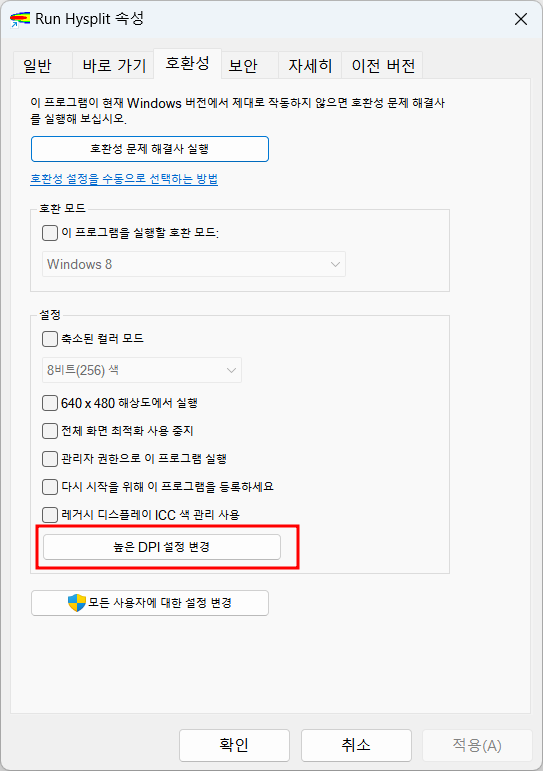 바로가기 아이콘에서 마우스 우클릭하여 속성창을 열고 호환성 → 높은 DPI 설정 변경을 클릭합니다.