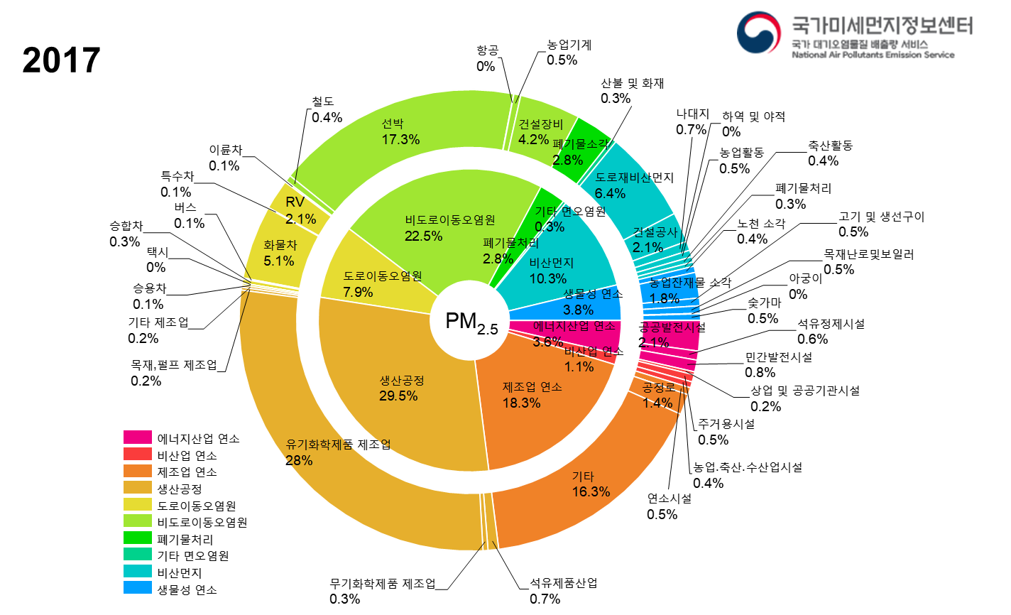 미세먼지(별다른 표시가 없으면 미세먼지는 PM2.5를 의미합니다) 전체 배출량과 점선면 배출량 지도입니다. 산단(점 오염원, 면 오염원), 선박, 도로가 주요 배출원이라는 것을 알 수 있습니다.