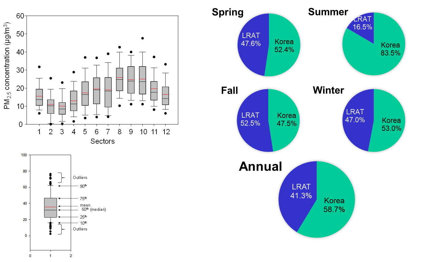 울산의 대기오염은 산단의 영향이 크지만, 장거리 이동 효과를 무시할 수 없습니다. 전문적인 모델링 연구팀에서는 CMAQ과 같은 대기화학모델을 이용하여 장거리 유입효과를 연구하지만, 제 연구실에서는 지상측정망, 역궤적, 하이브리드 수용모델, 화학성분자료를 이용하여 장거리 이동을 파악하고 있습니다.