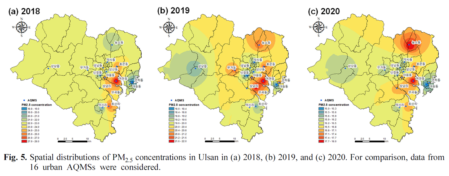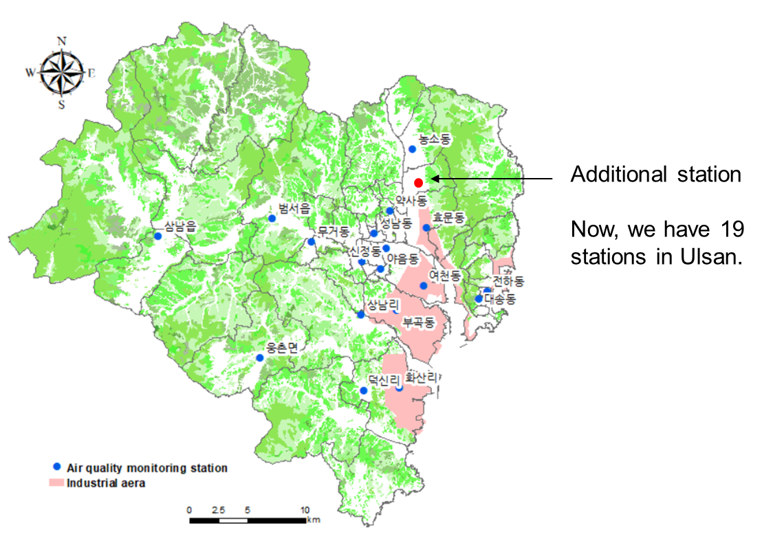 울산에는 19개의 도시대기측정소가 있습니다. 아래는 2021년 측정소 위치 지도인데, 한 개(빨간색)가 더 늘어서 현재는 19개 측정소가 있습니다. 울산의 미세먼지 측정지점에 대한 더 구체적인 내용은 아래 논문을 참고하세요. 아래 링크 제목은 영어로 되어 있는데 국문 논문입니다.
