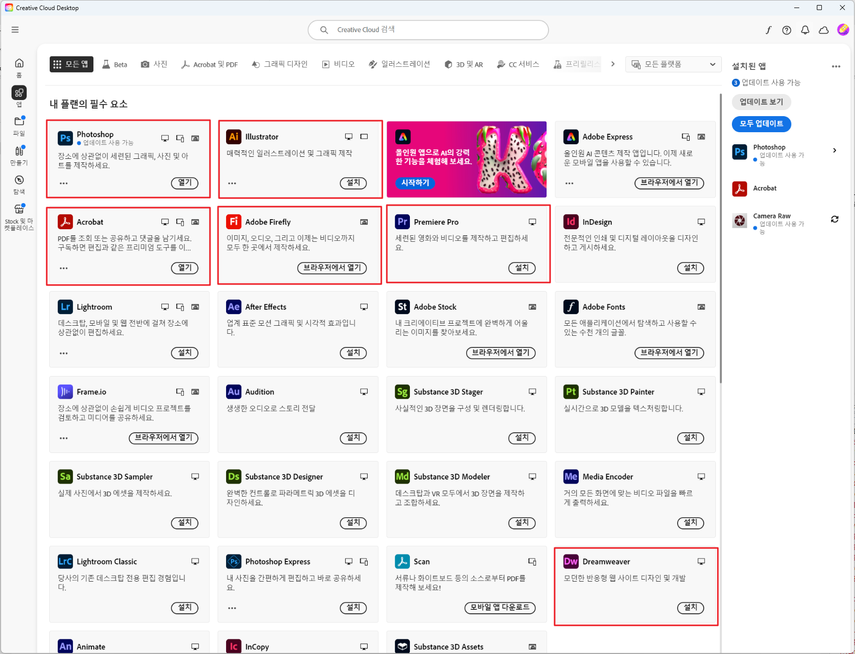 저는 아래 빨간색으로 표시한 프로그램을 사용합니다. 보통 노트북에는 포토샵과 아크로뱃 정도만 설치하고, 데스크탑에서는 동영상 편집과 홈페이지 작성 관련 프로그램을 추가로 사용합니다. 예전과 달리 단품 구입/설치가 아닌 구독형이기 때문에 상대적으로 저렴하게 고급 프로그램을 모두 사용할 수 있습니다.