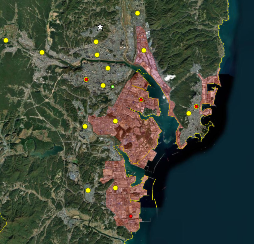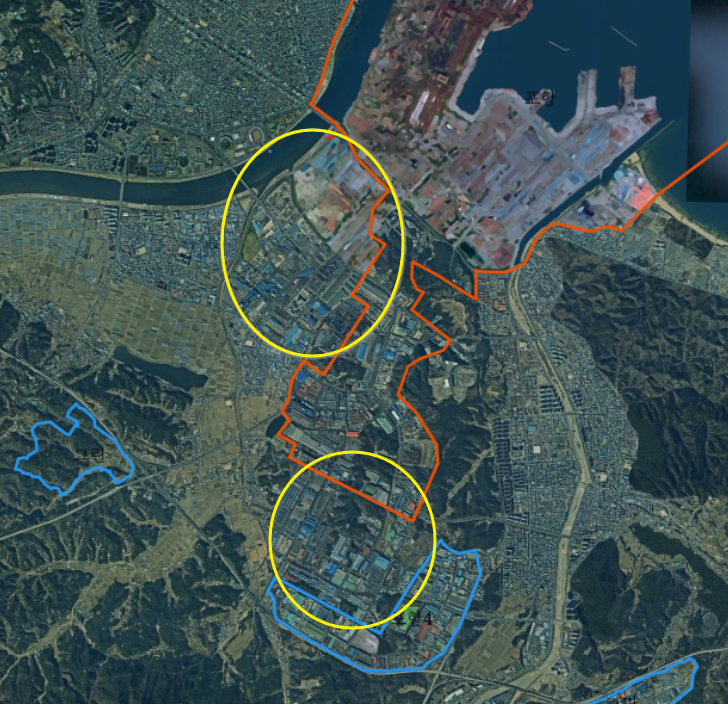 대기오염 연구 차원에서는 포항제철소와 철강산단의 위치 파악이 중요합니다. 그러나 공식적인 산단 경계 외에도 바로 인접한 곳에 공장이 많이 있습니다. 화면을 확대하고 산업단지에는 포함되지 않았지만 실질적인 산업지역을 노란색으로 표시했습니다. 주변에 주거지역이 있기 때문에 산업배출 영향을 파악하기 위해서는 함께 고려하는 것이 좋습니다.