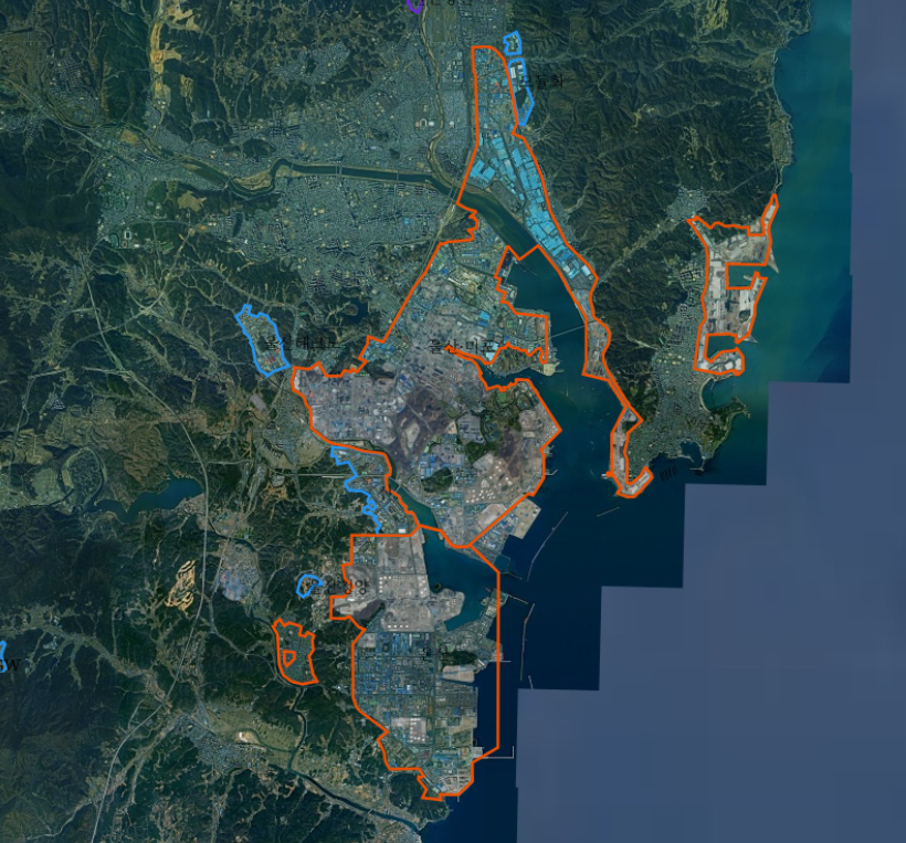 한편, 울산은 조금 상황이 다릅니다. 아래 왼쪽 그림의 빨간색 영역이 국가산단인데, 국가산단 주변에 파란색 일반산단이 있습니다. 그런데 워낙 국가산단이 크기 때문에 논문에서는 일반산단을 제외하고 있습니다. 또한, 지도 가장 아래에 있는 온산산단 서쪽에 있는 온산읍 덕신리 일대도 국가산단으로 표시되어 있습니다. 그래서 연구할 때는 산단에서 제외해야 합니다.