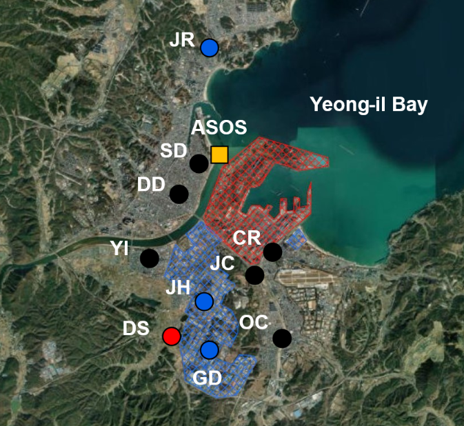우리 연구실 주정태 학생 논문에 들어가는 그림 일부입니다. 공식적인 산단(포항국가산단 + 포항4일반산단)과 주변 산업지역까지 모두 포함해서 산단으로 표시했습니다. 이렇게 하는 것이 오염물질 배출과 주변 지역 영향 파악 차원에서 유리합니다.