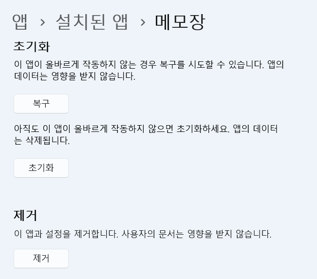 윈도우 설정에서 메모장 초기화와 재설치도 했는데 작동하지 않았습니다.