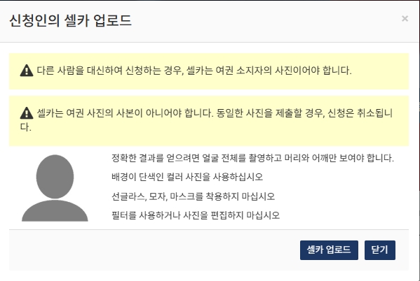 - 여권 사진과 다른 사진 (셀카 가능): 저는 컴퓨터 화상회의용 카메라로 찍고 포토샵으로 배경만 삭제(흰색으로 수정)했습니다. 별도 규격 없이 증명사진 정도의 가로 세로 비율 정도로 편집했습니다.