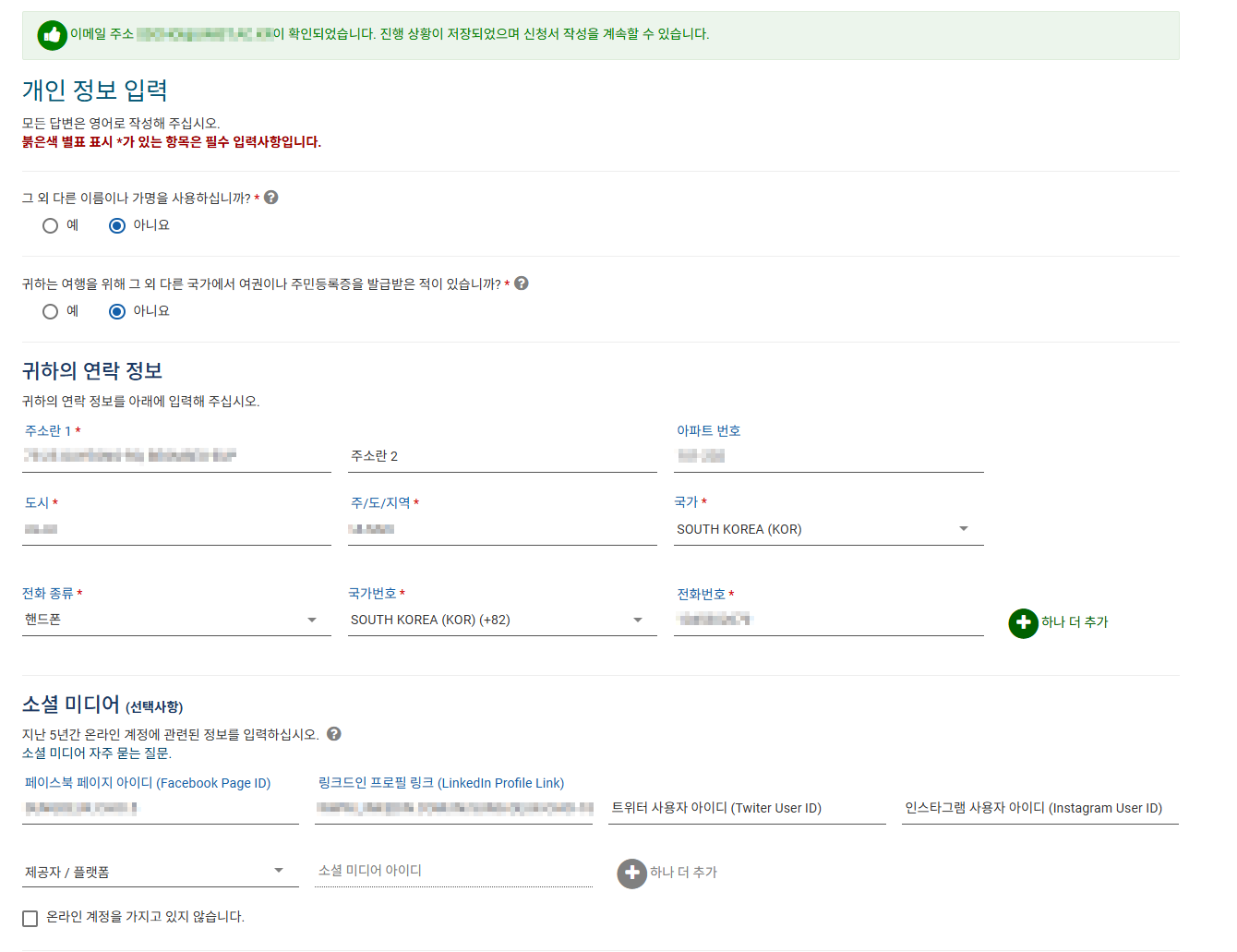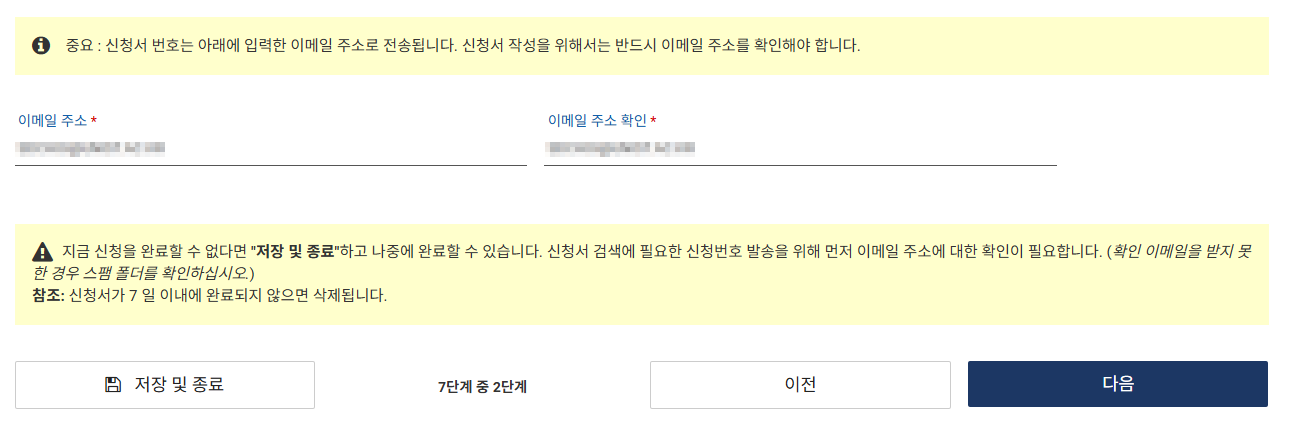 이메일이 확인된 후 다음과 같이 신청서 작성을 계속 진행할 수 있습니다.