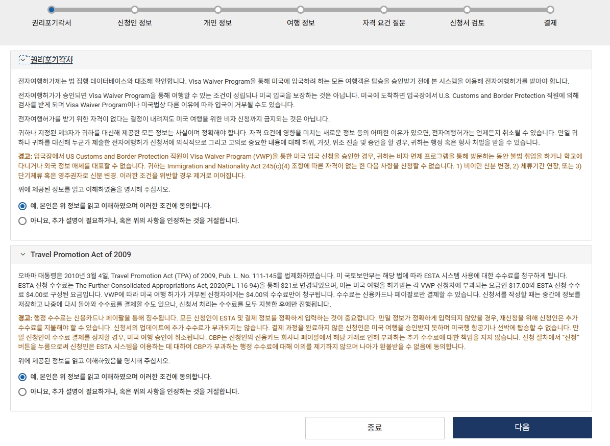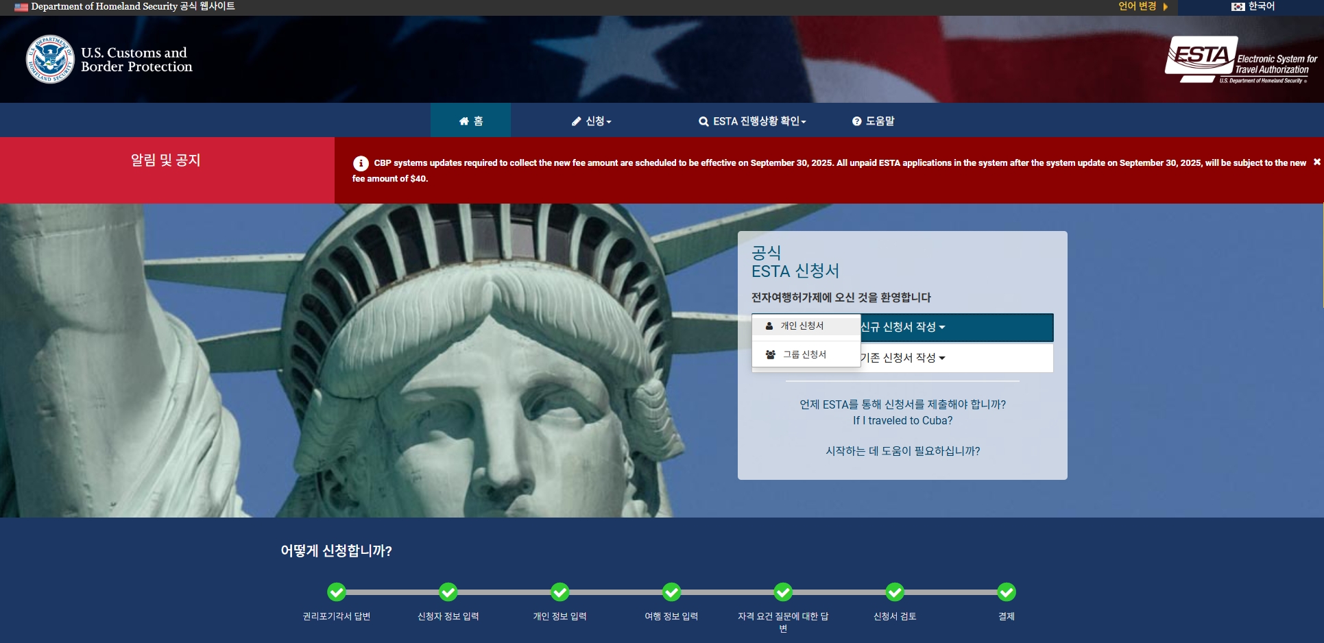 Official ESTA Application Website, U.S. Customs and Border Protection 이 사이트에 방문해서 우상단에서 언어를 한국어로 변경합니다. 신규 신청서 작성 → 개인 신청서를 클릭합니다.