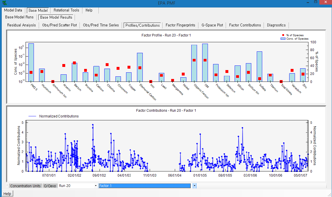 윈도우 GUI 모델이라서 누구라도 쉽게 사용할 수 있습니다. 초보자도 매뉴얼 따라서 연습하면 금방 모델을 사용할 수 있습니다. 그러나 모델 결과 해석에 사용자의 주관이 너무 많이 들어가기 때문에 똑같은 모델링 결과를 주더라도 해석이 많이 다를 수 있습니다. 다변량 측정 자료를 입력자료로 사용해서 10개 내외의 인자(factor)가 나오면 개별 인자가 어떤 오염원을 의미하는지 사용자가 직접 정의를 해서 자료를 해석해야 합니다. 우선, 측정 지역에 대한 상세한 오염현황 이해가 없으면 factor에 엉뚱한 이름을 붙이게 됩니다. 그리고 하나의 factor가 개별 오염원을 의미하는 경우가 많지만 여러 오염원이 섞인 경우도 있습니다. 또한, 이전 많은 연구 논문에서 물리적인 오염원(자동차, 제련공장 등)과 개념적인 오염원(석탄 연소, 2차 생성, 산업활동 등)이 마구 섞여 있습니다. 명확한 기준 없이 오염원을 정의한 셈입니다.