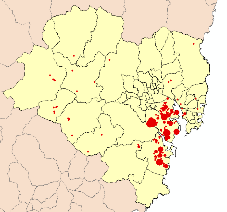 아래와 같이 울산과 주변 도시에 점오염원이 분포하고 있습니다. 전국지도에서 울산지도만 추출한 것처럼, 전국 점오염원 배출량 자료에서 울산의 점오염원 배출량 자료만 추출할 수 있습니다.