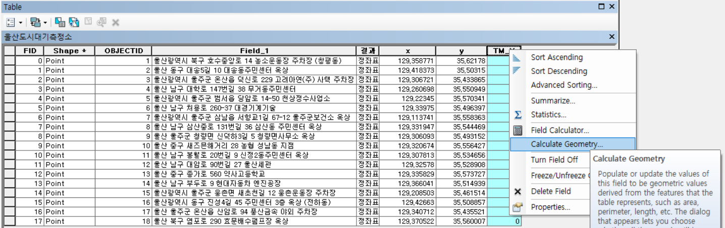 테이블에 필드가 추가되었습니다. 마우스 우클릭으로 Calculate Geometry를 선택합니다.