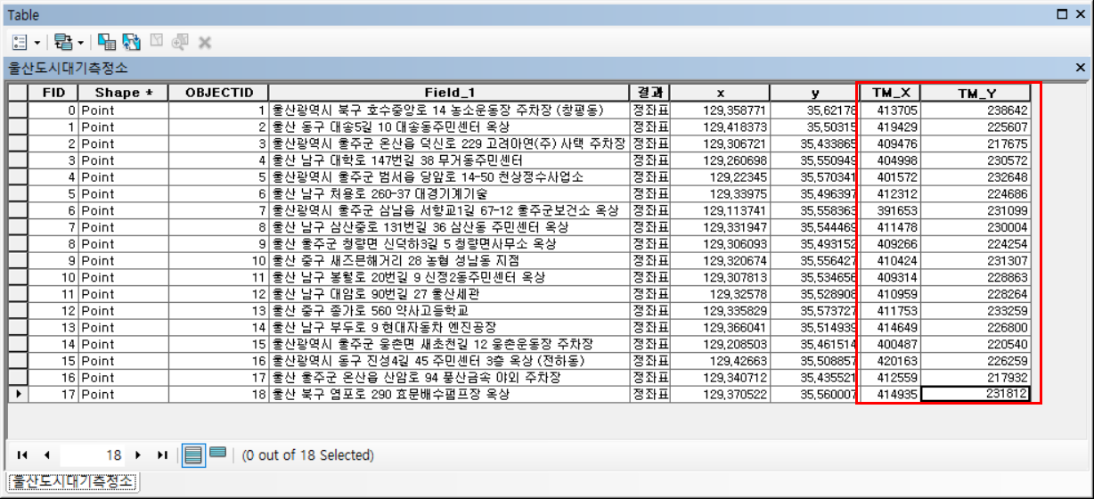 ArcGIS 테이블에서 경위도를 TM 좌표로 변환하는 방법입니다.