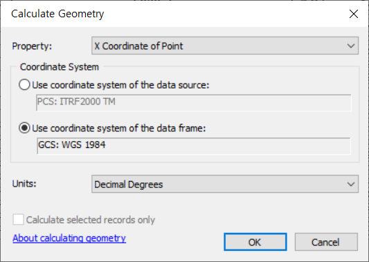 이전 글(ArcGIS 10.X 좌표계 설정)에서 언급한 것과 같이 프로젝트 툴을 이용해서 경위도 좌표를 ITRF2000 TM 좌표 형식으로 변환할 수 있지만, 속성 테이블의 수치가 변하지는 않습니다. 이 경위도 수치를 ITRF2000 TM 좌표 수치로 변환하고자 합니다.