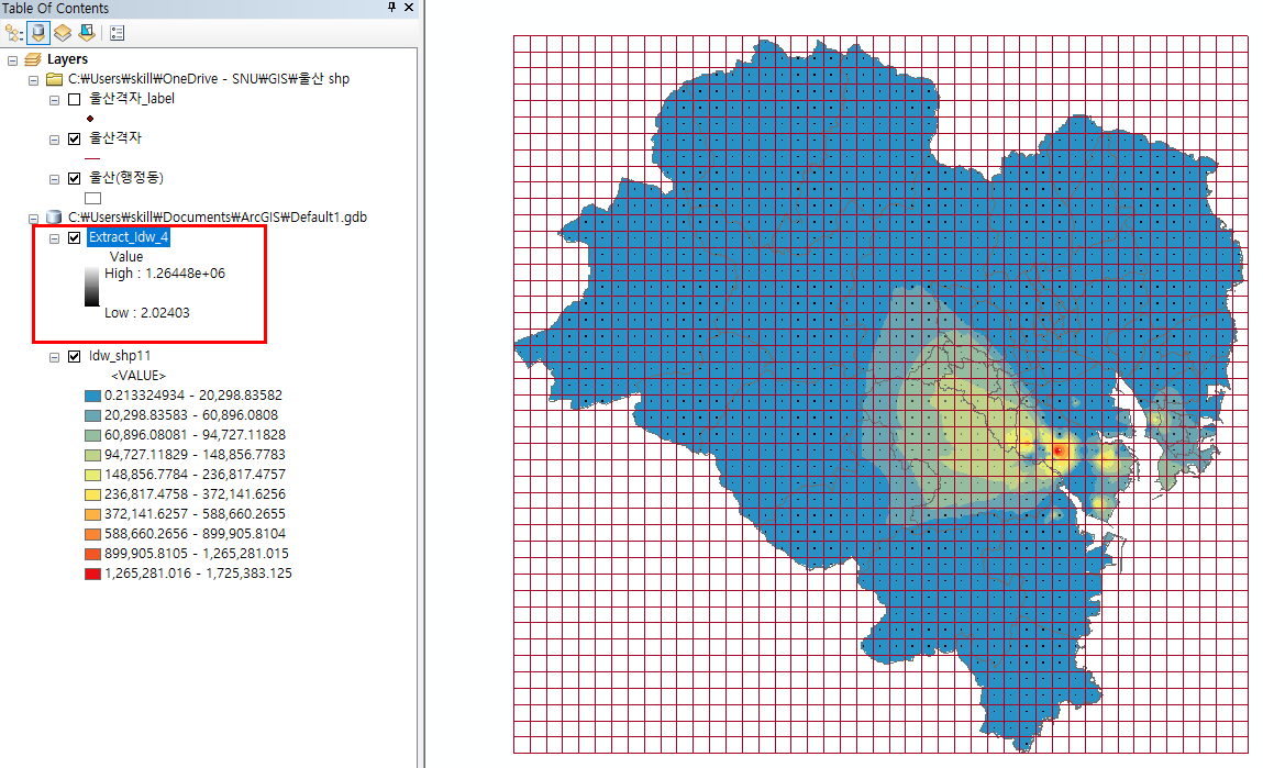 마지막으로 격자별 평균값의 분포를 Graduated color로 확인해 봤습니다. 보간법 결과와 잘 일치합니다.