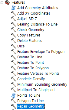 그런데 이 행정동 자료를 사용해서 Feature to Point (Inside) 도구를 실행하면 에러 메세지(000072: Cannot process feature with OID)가 나옵니다. 이를 해결하려면 Geometry Repair 도구를 사용합니다.