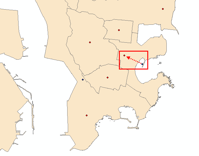 다른 행정구역은 문제가 없는데 동구 일산동은 ㄷ자 형태이므로 중심점이 육지가 아닙니다. 따라서 이 중심점에 일산동 자료가 할당되더라도 배경 지도 shp 파일에서는 제대로 표출될 수 없습니다.