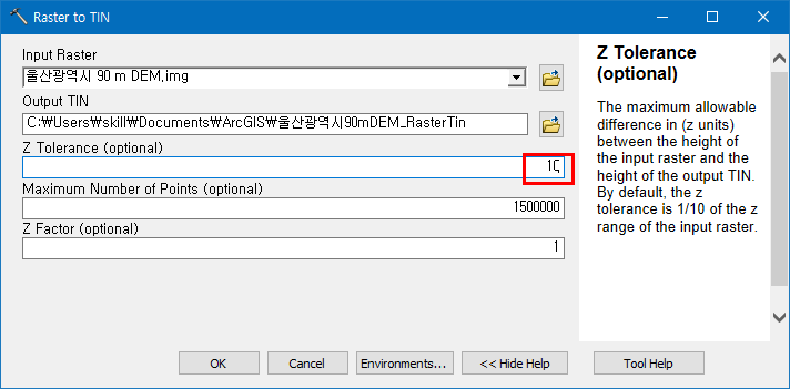 Raster To TIN 도구를 실행하고 Z Tolerance에 10을 입력해서 10 m 간격으로 설정하고 OK를 누르면 됩니다. 아주 간단합니다.
