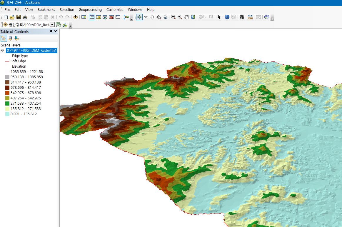 TIN 파일을 ArcScene에서 열면 3차원 지형을 파악할 수 있습니다.