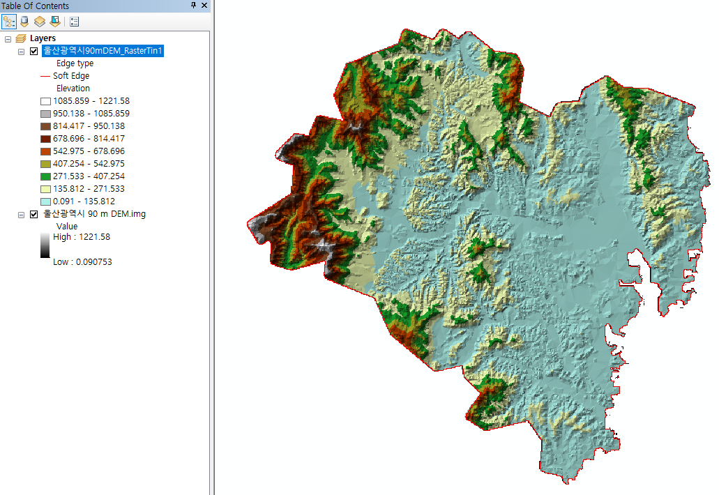 이전 글에서 생성한 울산 DEM 자료를 오른쪽과 같이 TIN으로 변환해서 더 입체적으로 지형을 파악할 수 있습니다.