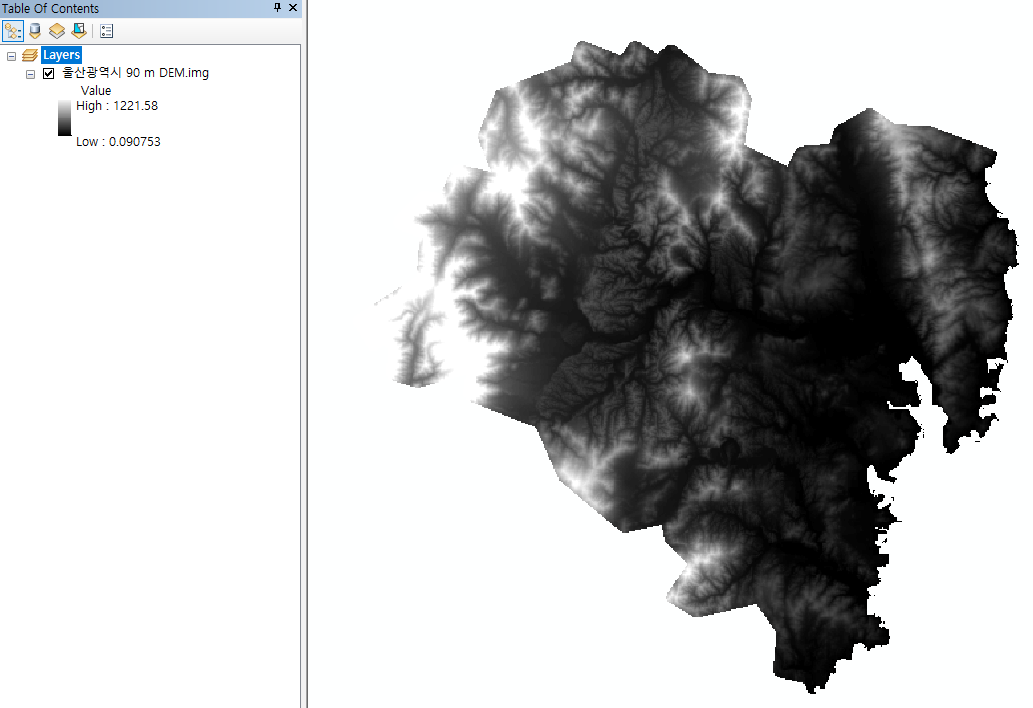 수치표고모델 자료 중에서 울산 자료를 다운 받습니다. 수치표고모델(DEM)_90M - 오픈마켓 지형의 고도값을 수치로 저장함으로써 지형의 형상을 나타내는 지도 data.nsdi.go.kr 5개 img 파일을 ArcGIS에서