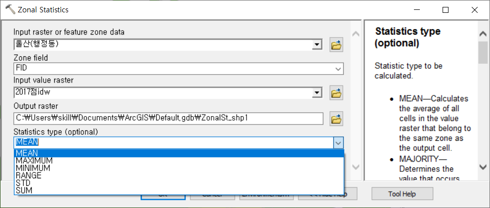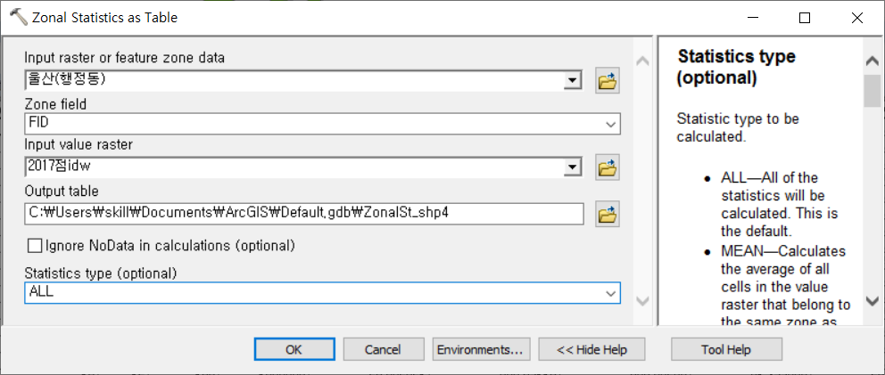 공간보간 래스터 파일의 자료를 행정구역별로 할당해서 별도의 래스터 파일과 속성 테이블을 만들겠습니다. 이 방법은 대기오염이나 토양오염(많이 권장하지는 않음) 측정자료나 모델링 결과를 행정구역에 할당하는 방법으로 지역별 농도 순위를 산정할 때 유용합니다.