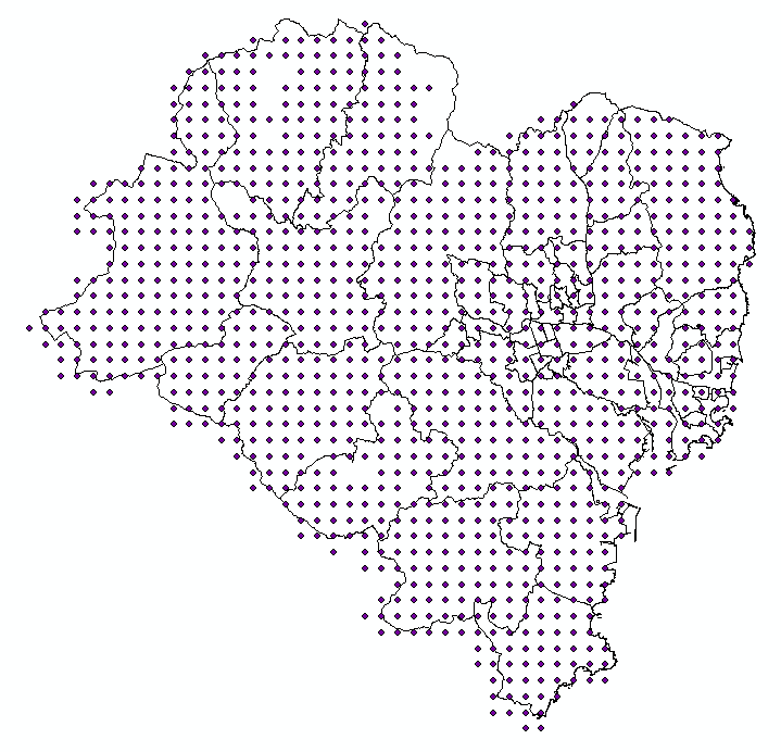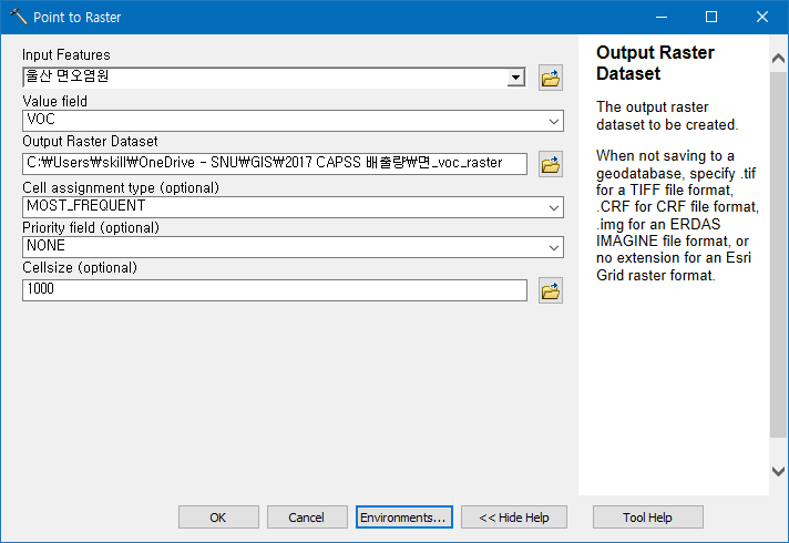 그러나 실제 자료는 1 km × 1 km 격자셀 안에서 동일합니다. Point to Raster 도구를 사용해서 1 km (1000 m) 크기의 격자셀을 만들 수 있습니다.