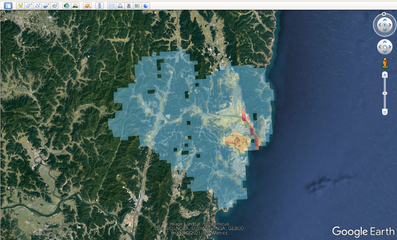 Layer To KML 도구를 이용해서 구글 어스 지도에 올리고 투명도 50% 정도를 적용했습니다.