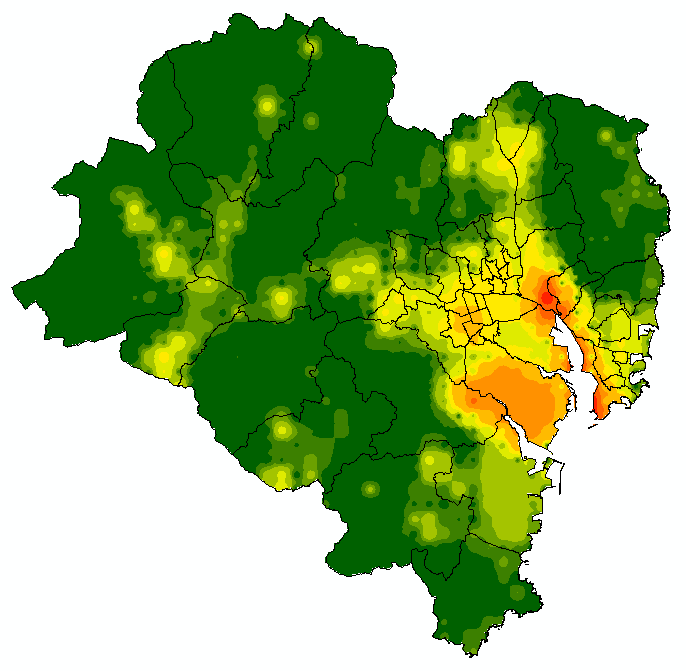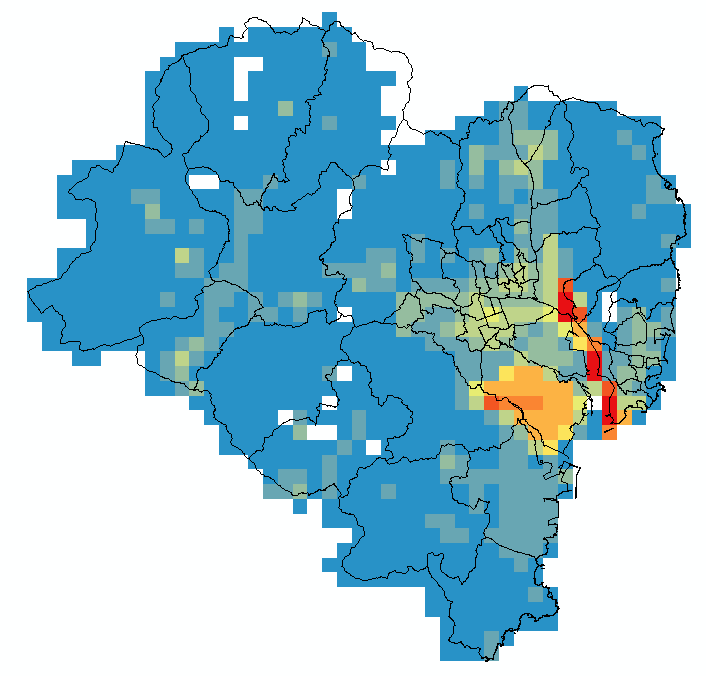 환경부에서 제공하는 면오염원 배출량 자료는 1 km × 1 km 격자셀 자료입니다. 이 자료를 100 m 간격의 보간법으로 나타내면 오른쪽과 같습니다.