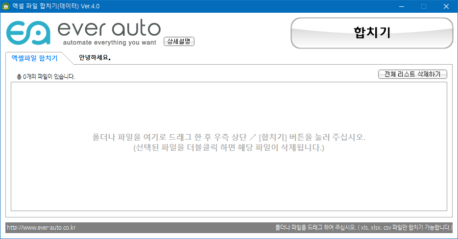 설치형이 아닌 바로 실행되는 파일입니다. 아래 창에 합치려는 엑셀 파일을 모두 선택해서 옮기고 합치기를 실행하면 됩니다.