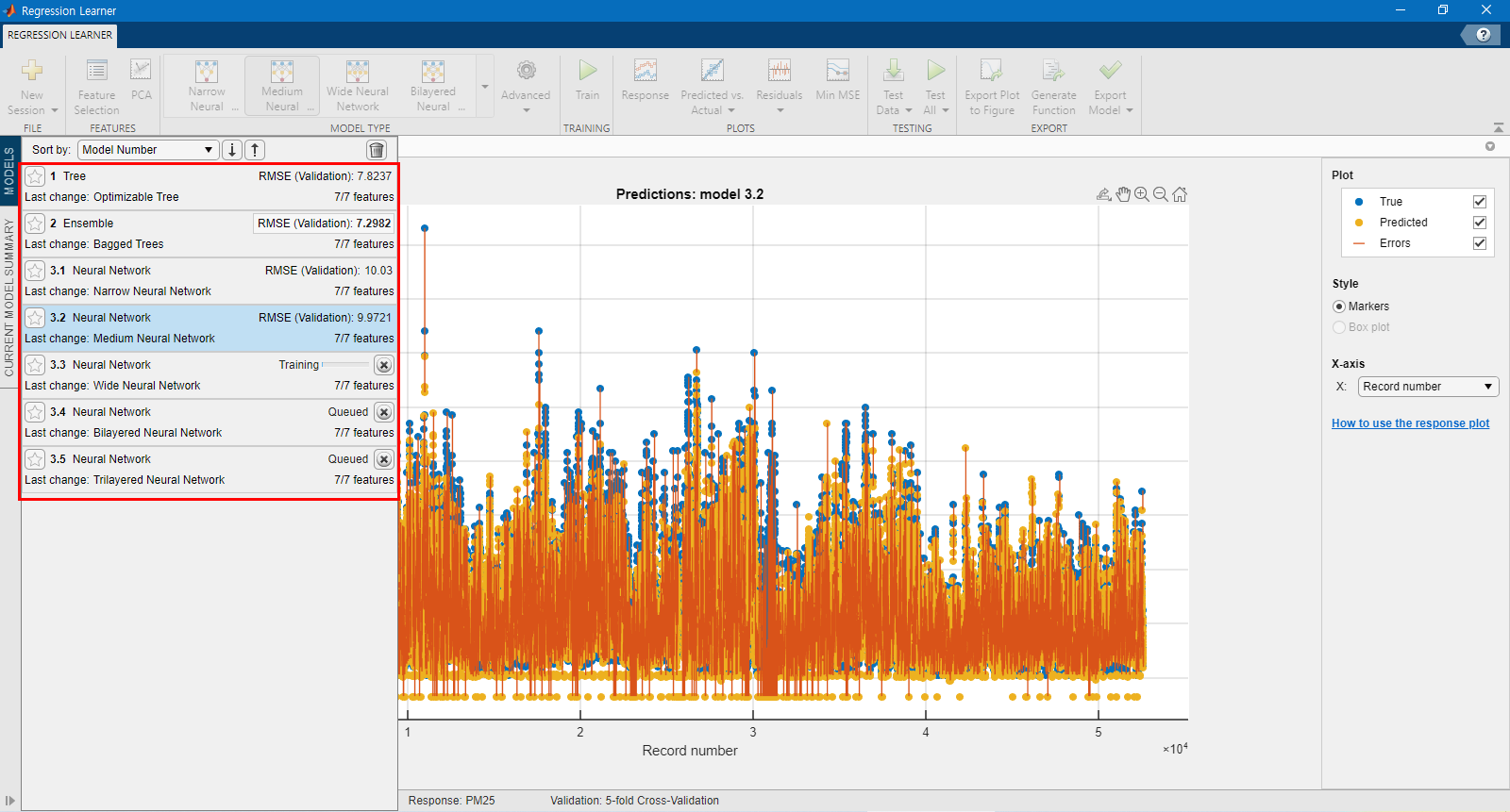 위에서는 Bagged Trees 기법을 사용했는데, 다양한 기법을 모두 이용해서 한 번에 결과가 나오게 할 수도 있습니다. 아래 그림과 여러 인공신경망 기법을 순차적으로 적용할 수도 있습니다. 인공신경망보다는 Tree 앙상블 결과가 더 좋았습니다.