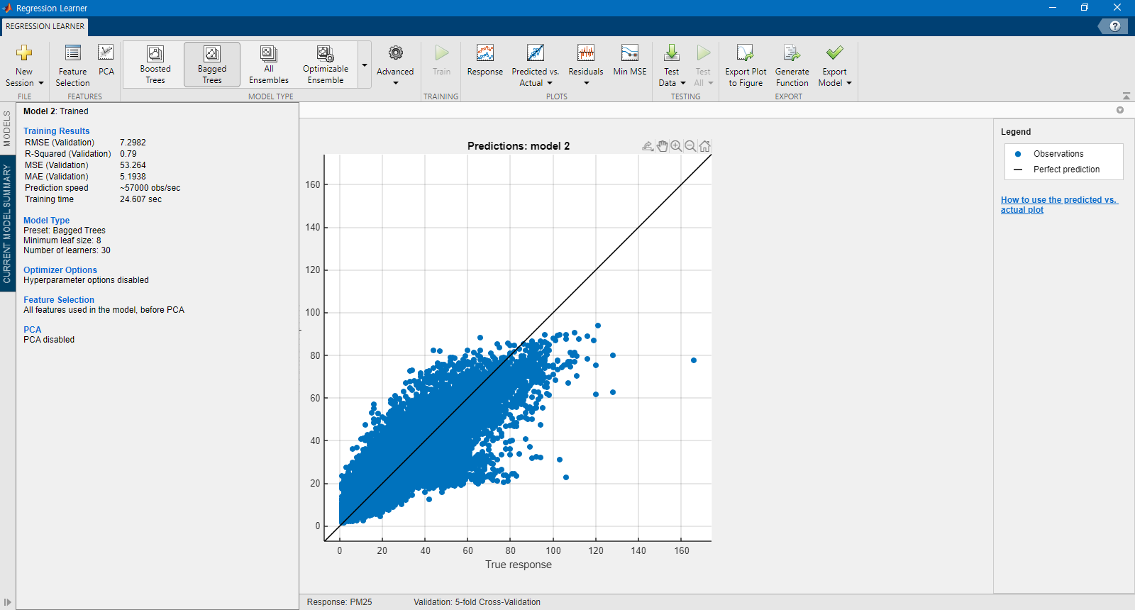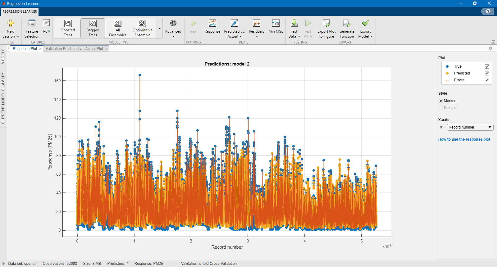 아래 도움말에서 기계학습 전반적인 내용을 파악할 수 있습니다. 회귀학습기(Regression Learner)를 사용해서 오염물질 농도를 예측할 수 있습니다.