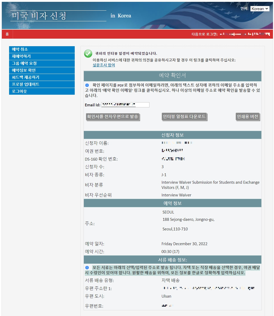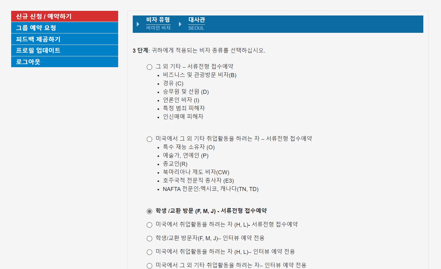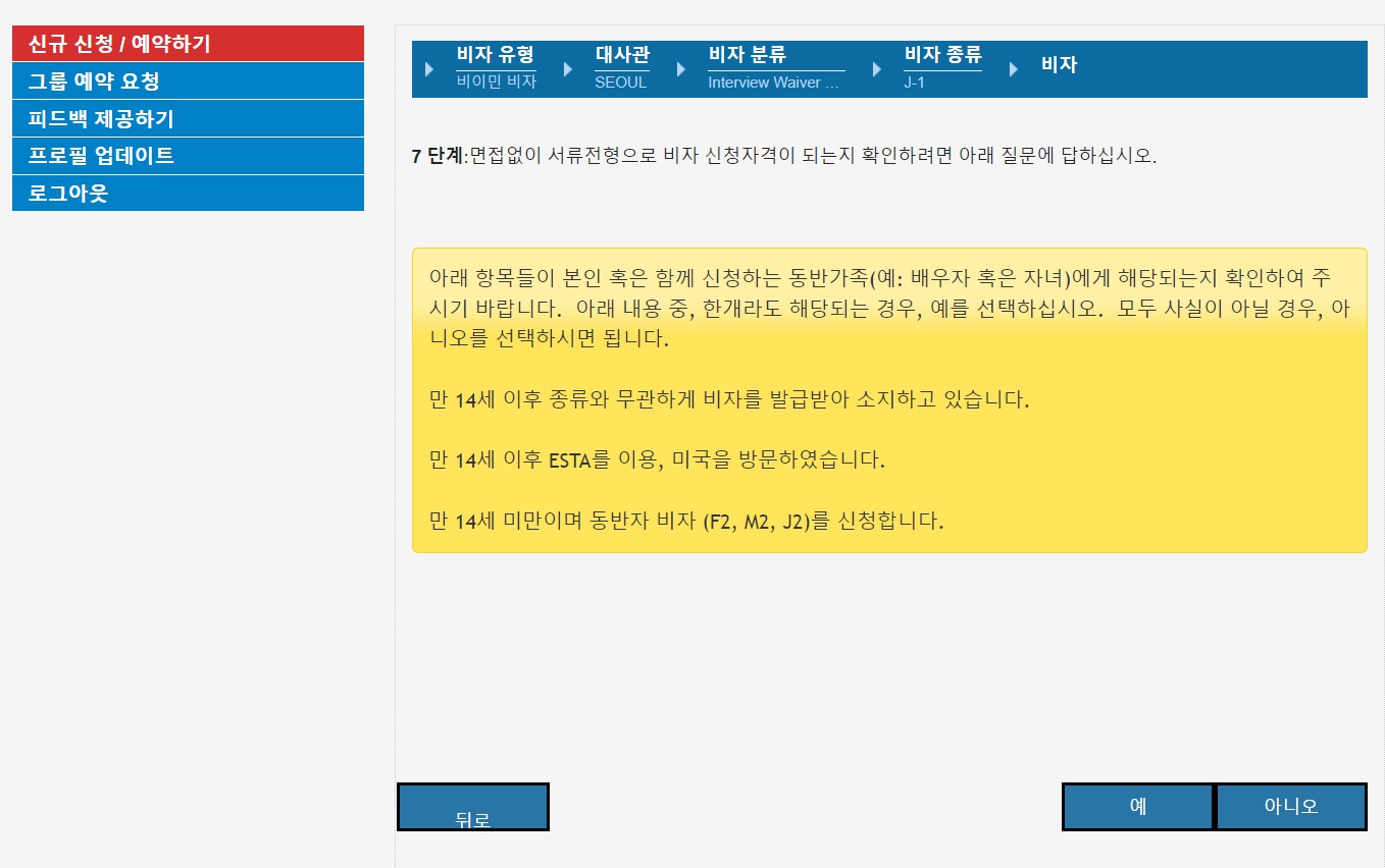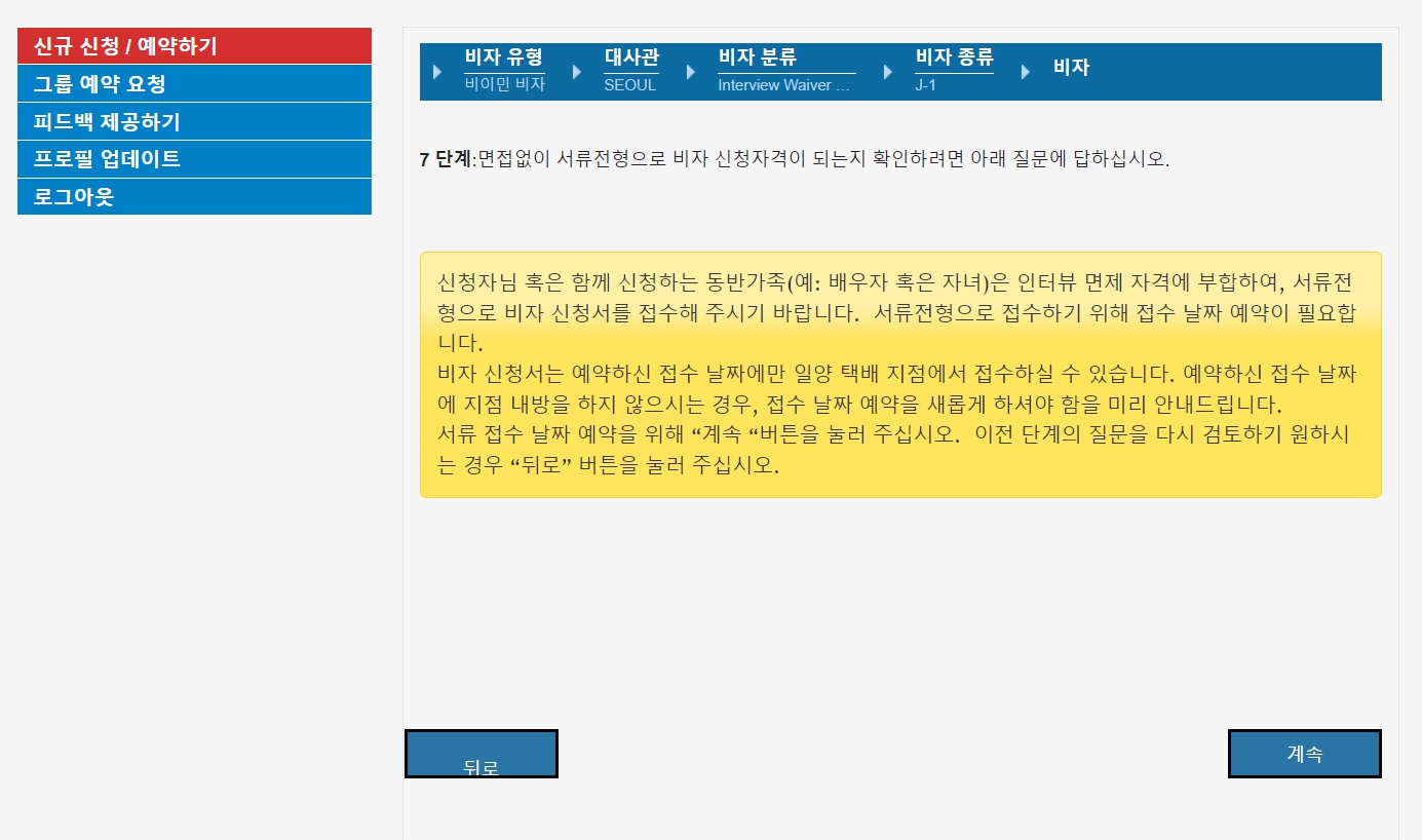 저는 교환방문 - 서류전형 접수예약을 선택했습니다. 예전에 미국 비자 받을 때는 서울에 있는 미국 대사관에 방문했었는데, 현재 J1 비자는 일정 조건에 부합하면 서류 제출만으로 인터뷰 없이 발급 받을 수 있습니다.