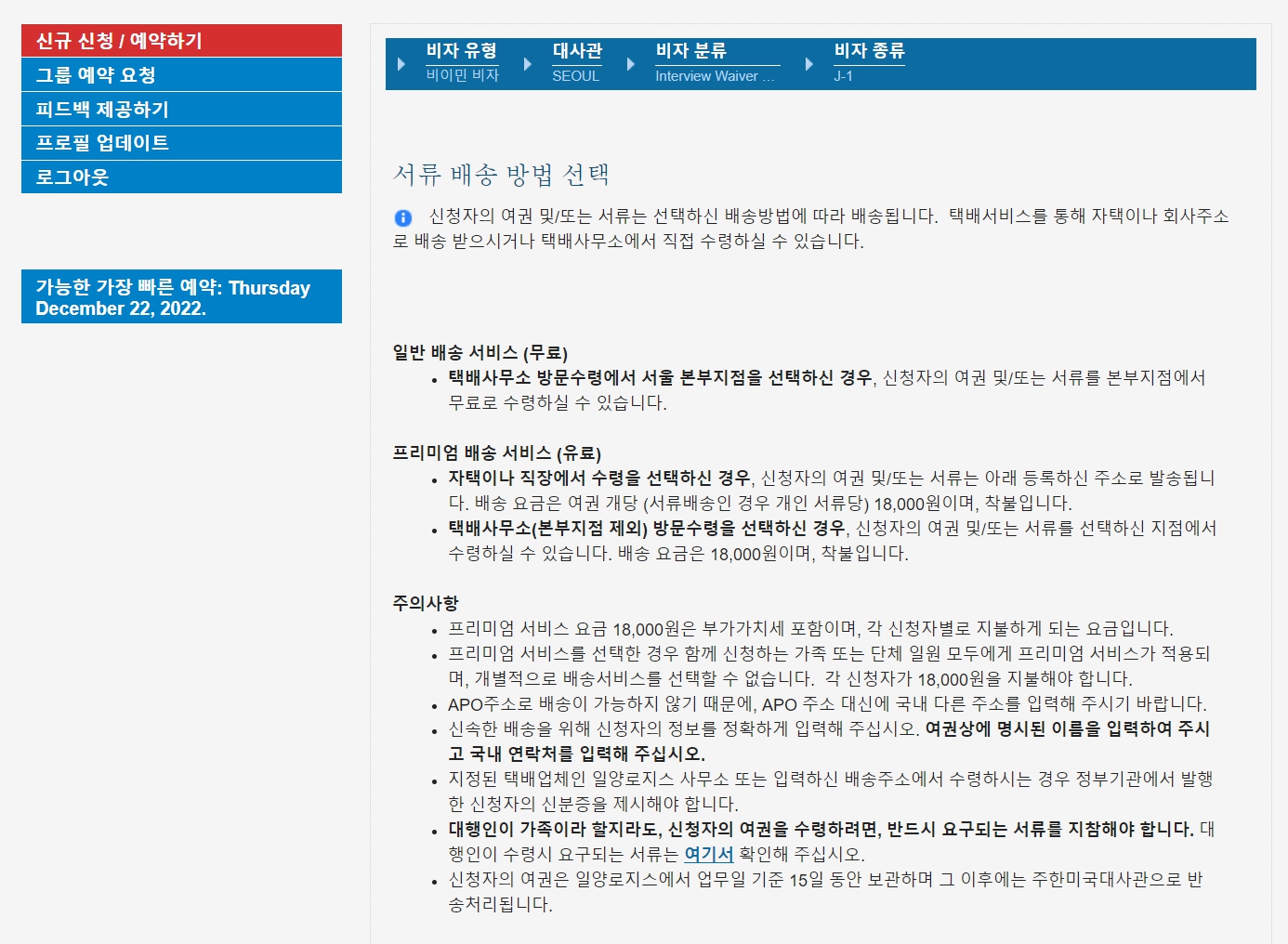 인터뷰 일정을 예약합니다. 저는 인터뷰 면제이기 때문에 여기서 인터뷰 일정은 비자 신청에 필요한 서류를 일양택배에 접수하는 날짜를 의미합니다.