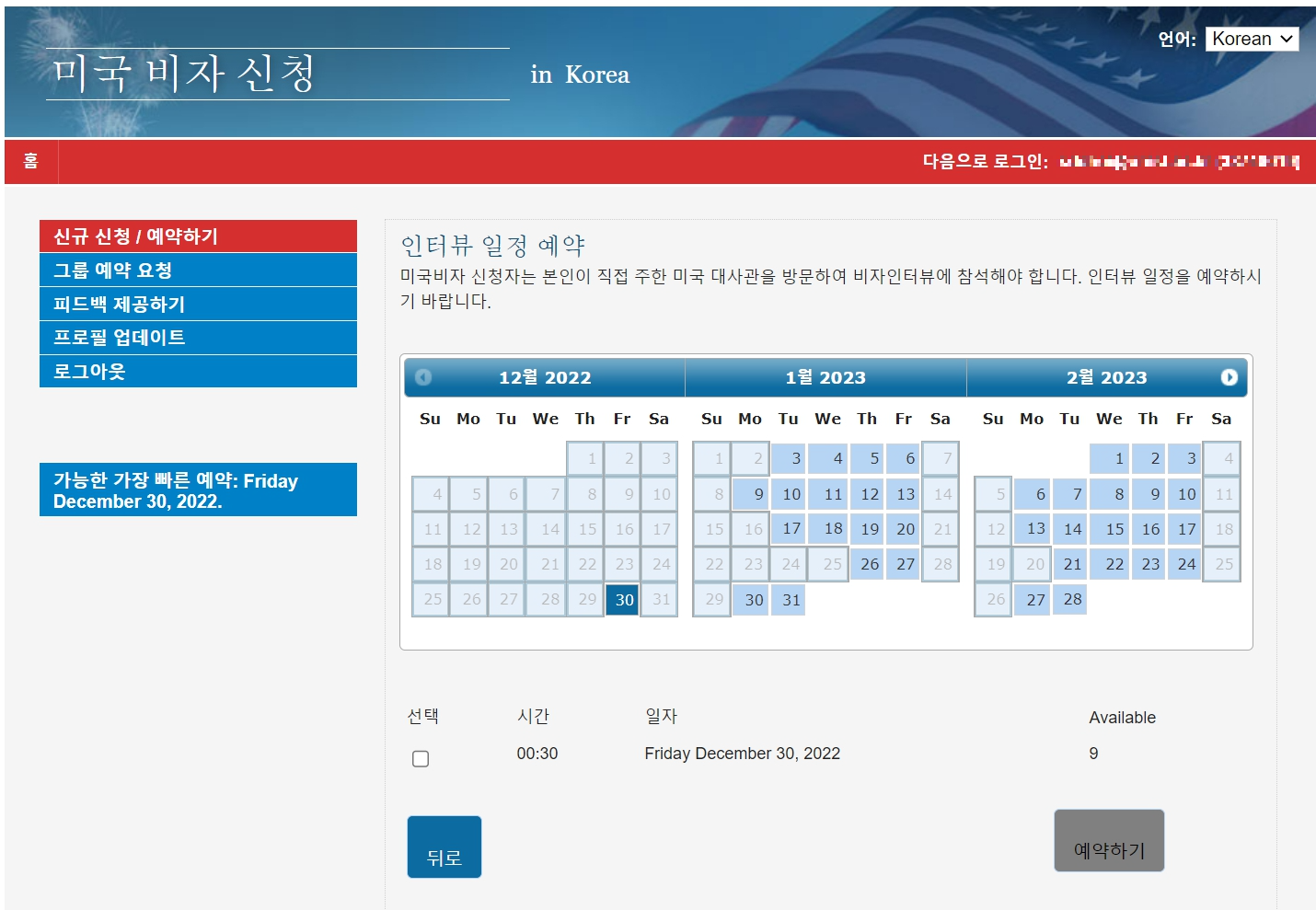 가장 빠른 일정인 12월 30일을 선택했습니다.