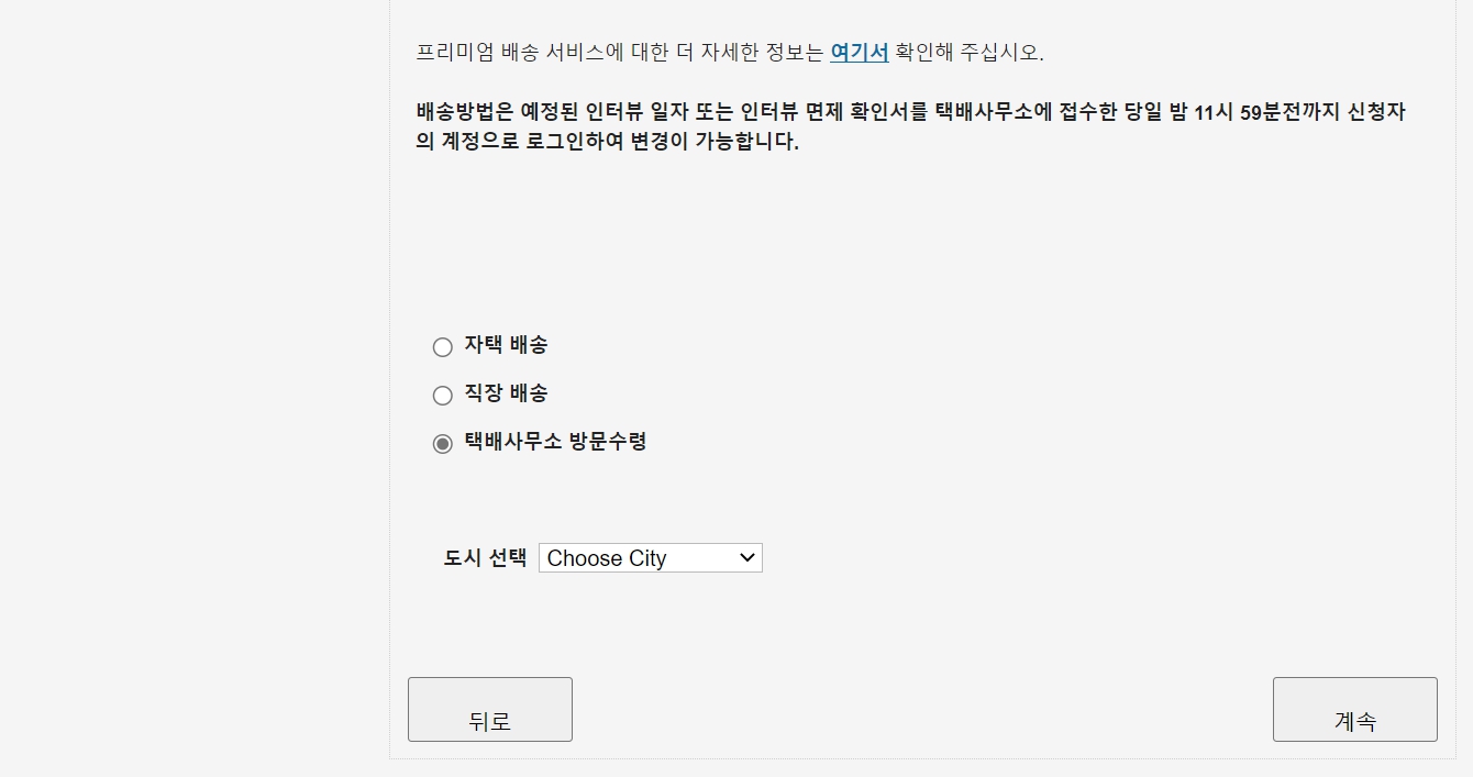 대사관에서 비자가 발급되면(여권에 붙이면), 택배로 받을 수 있습니다. 자택, 직장, 택배 사무소를 선택할 수 있습니다. 저는 자택을 선택했습니다.
