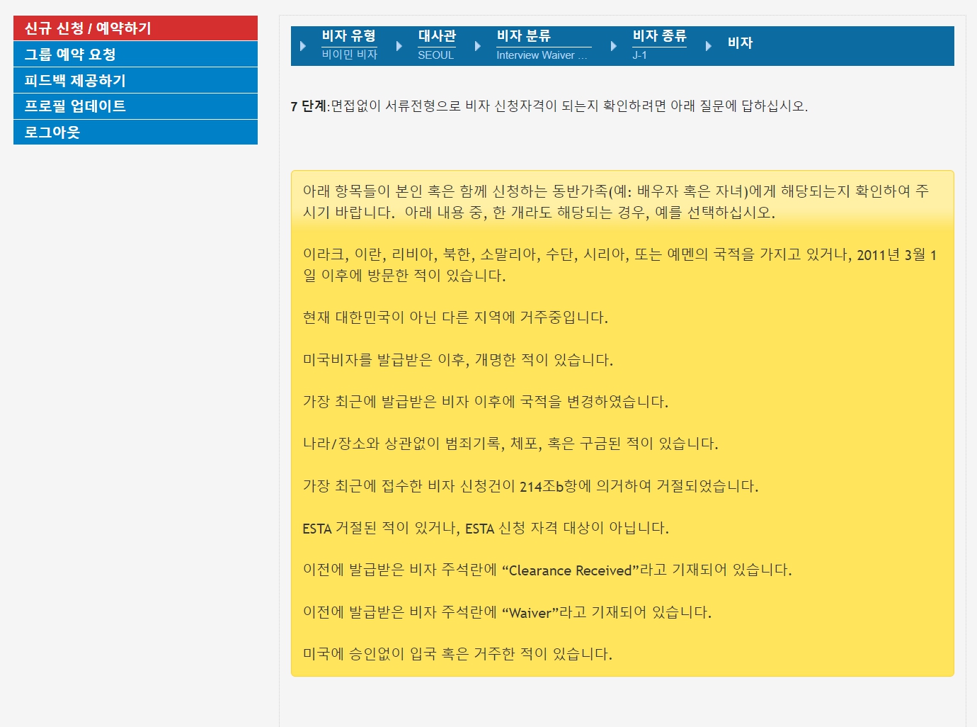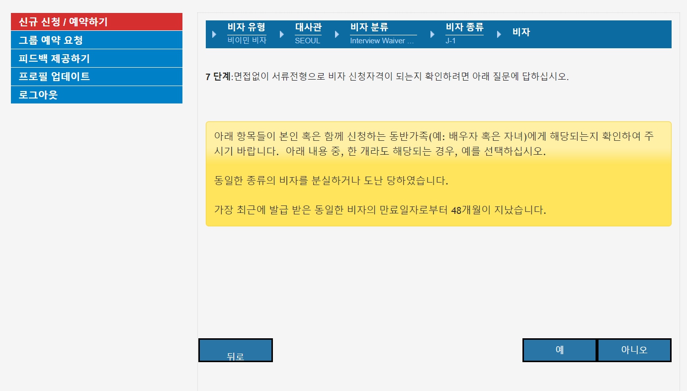 위에서 예, 아니오, 아니오, 예를 선택하면 아래와 같이 인터뷰 면제 조건이라는 메세지가 나옵니다.