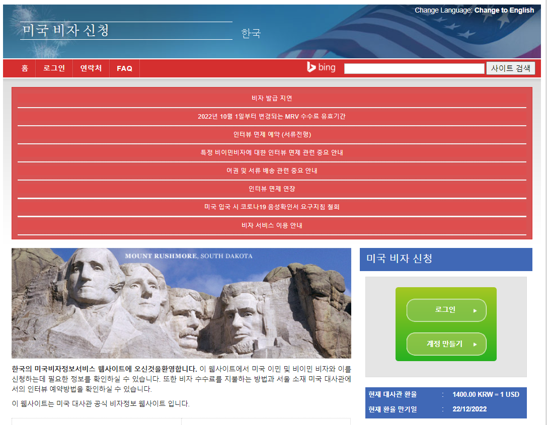 비자 신청 전반적인 내용을 알 수 있습니다. 계정이 있으면 로그인으로 들어가고 없으면 "계정 만들기"를 클릭합니다.
