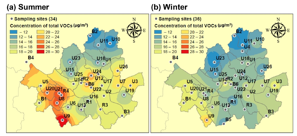 이 논문에서는 대기오염물질 농도뿐만 아니라, 공기 역궤적 밀도 그림도 작성했습니다. 계절별로 어디에서 서울로 바람이 많이 부는지 알 수 있습니다.