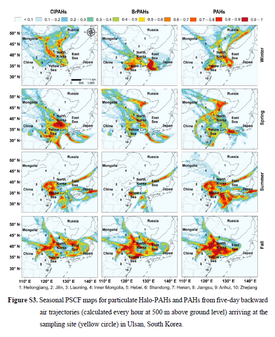 마지막으로, 아래 그림은 대표적인 발암물질인 PAHs와 Halo-PAHs가 중국에서 국내로 유입되는 그림입니다. 박사과정 Quang 학생이 올해 게재한 논문에 수록된 그림입니다. 이 외에도 많은 연구 사례가 있지만, 이 정도로 마치겠습니다.