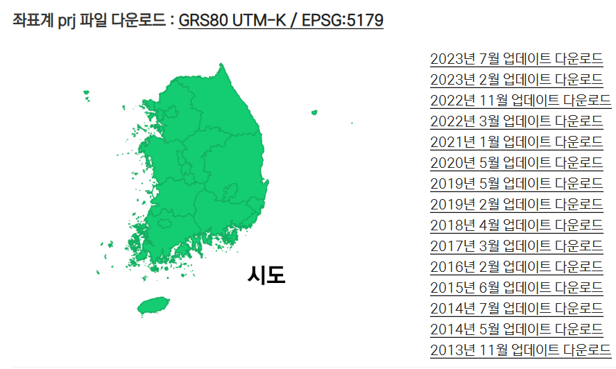 전국 지도 shp 파일을 다운로드할 수 있는 사이트입니다. 시도, 시군구, 읍면동(법정동), 리 단위의 전국 지도가 있습니다. 보통 전국 측정망 자료 등을 표시할 때는 시군구 shp 파일을 사용하고, 도시 규모에서는 읍면동 단위 파일을 사용합니다.