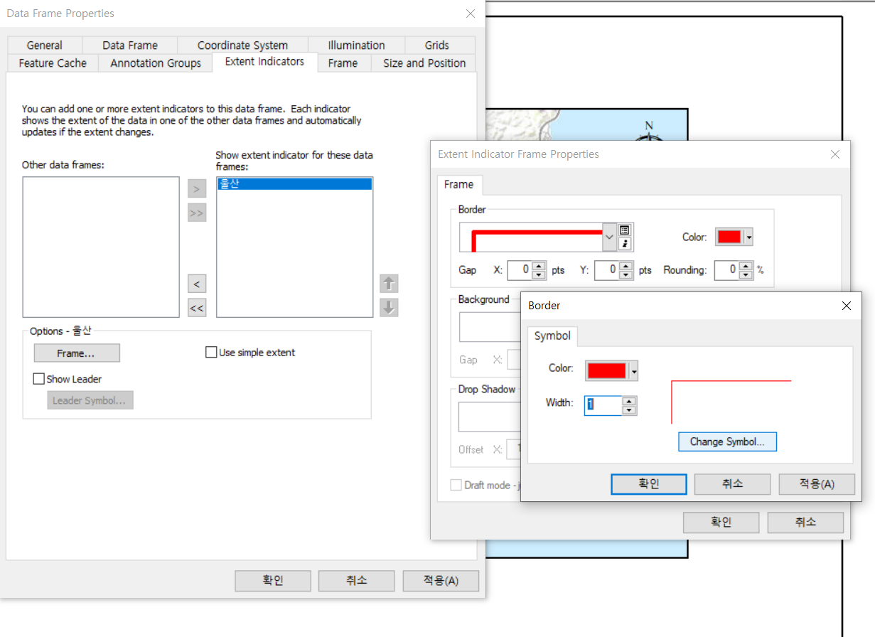 동북아시아 데이타 프레임 속성에서 Extent Indicator를 추가하고, 선 굵기를 조정합니다.