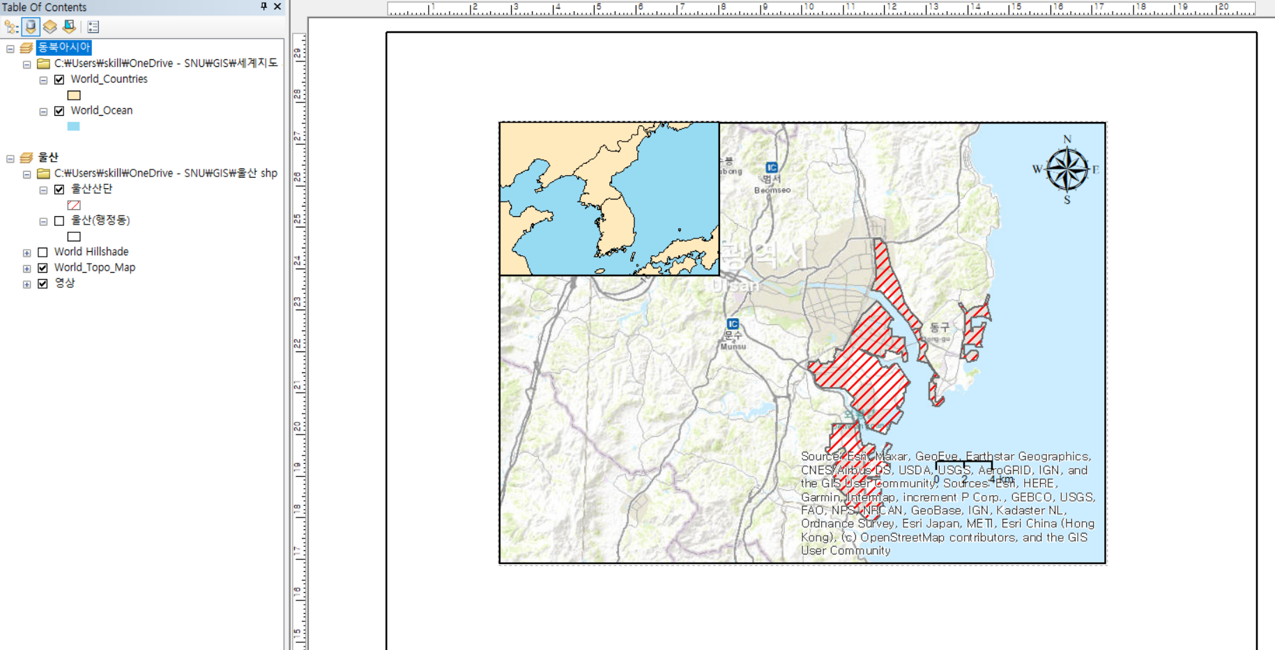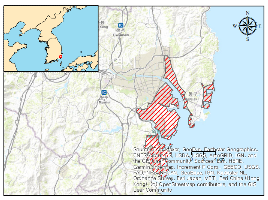 아래 그림과 같이 상세 지도의 위치를 빨간색 박스(Extent indicator)로 나타낼 필요가 있습니다. 예를 들어, 논문에 우리나라 지도만 표시하면 외국인들은 어디인지 모르기 때문에 동북아시아 지도를 함께 나타내야 합니다. 울산 지도를 그릴 때는 전국지도도 함께 나타내는 것이 좋습니다.