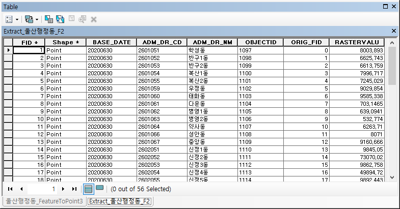 우선 Feature To point 도구를 이용해서 개별 행정동 가운데에 한 개의 대표지점(포인트)가 추가합니다.