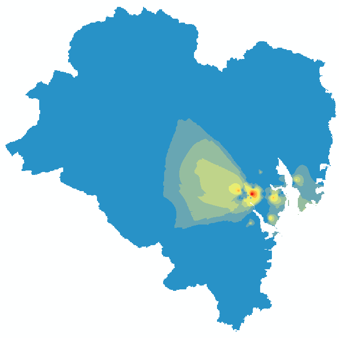 보간법을 이용하면 전체 행정 구역에 대해서 자료가 산출됩니다. 이 결과를 행정구역별 중심점에 할당하겠습니다.