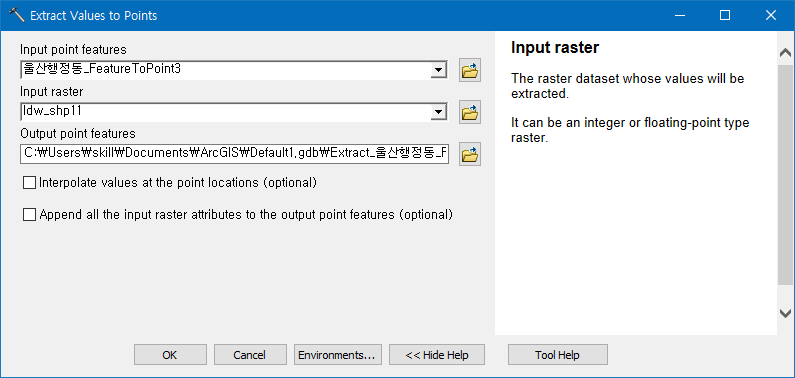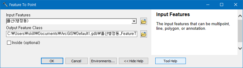 - Input point features에는 앞에서 생성한 Feature to Point 결과를 입력합니다.