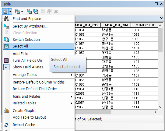 테이블 메뉴에서 Select All을 클릭해서 모든 자료를 선택합니다.